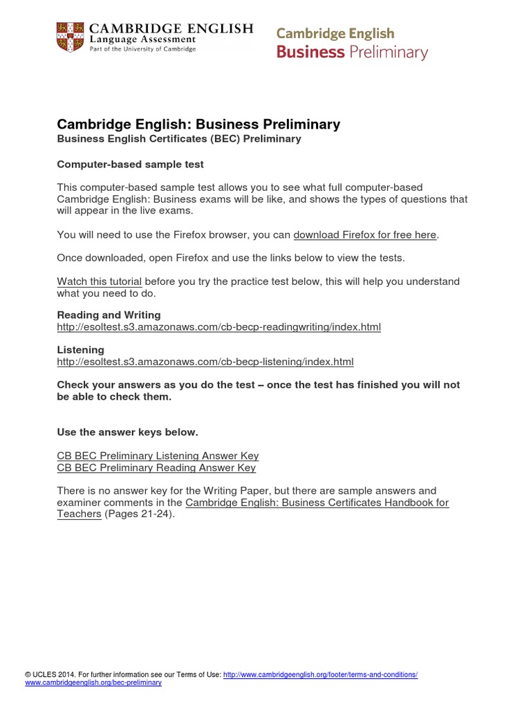 These examination papers from University of Cambridge ESOL Examinations Cambridge ESOL provide the most authentic exam. In this section you read five short texts. Business Preliminary Vantage and Higher also known as BEC and BULATS.